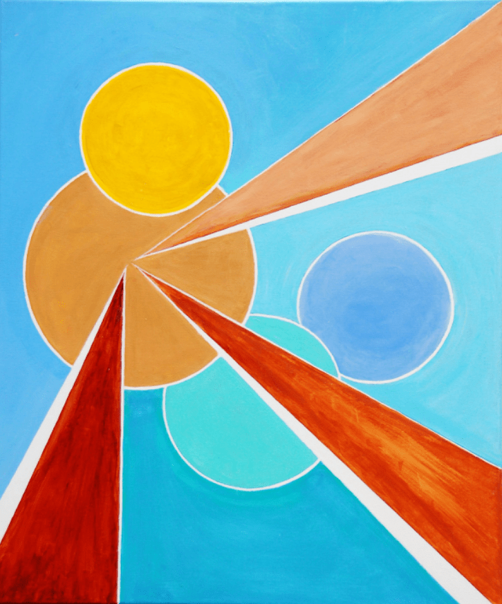 Ik vertrek meestal van een figuratief gegeven en verbreekt dat herkenbaar gegeven door het inbrengen van ritmes, contrasten en vooral kleuren. Meestal blijft er niets over van het initiële figuratieve zodat ze tot een half-abstract werk komt. Ze laat zich leiden door haar gevoel en zo door wat er op het doek gebeurt.Het werk plaatst zich in de traditie van geometrische abstractie. Kleur, gevoel en ritme blijven belangrijk.